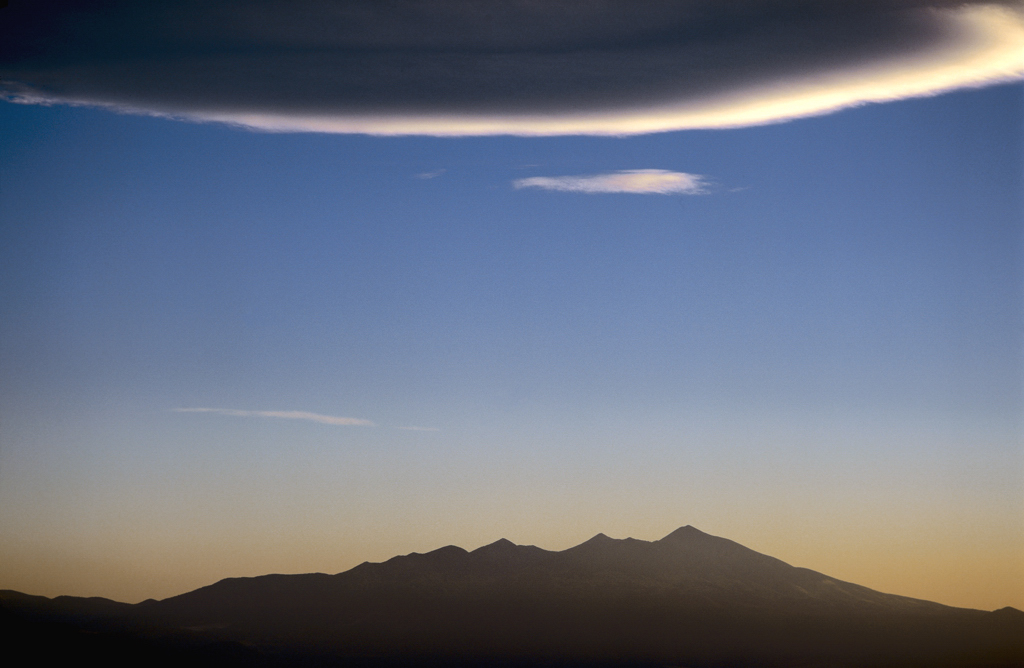 Lenticulars are fascinating. I think of them not as clouds (which they are), but as standing waves in a moving river. When wind streams up and over a mountain, the air is moving but the clouds stand still. Within the cloud, the rising air suddenly cools as pressure drops and moisture condenses. Beyond the peak and out of the cloud, visible water is sucked back into invisible air. Have you ever been taken aback by a quiet friend’s sudden outburst of anger or tears? Underlying emotions can suddenly surface and just as quickly disappear. Lenticulars are a lot like that. It’s not just still waters that run deep.