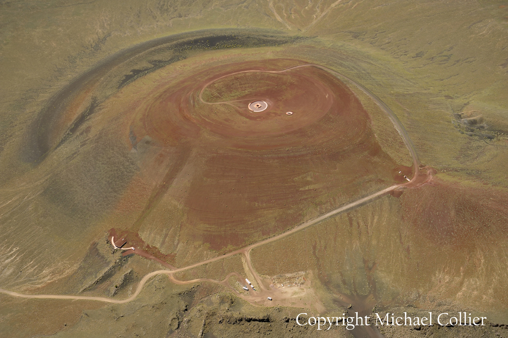We circled the crater, filming for a while. Then Terrell, unprovoked by enemy fire, dove for cover into its center. I followed, watching in disbelief as he flew wings-flat through the notch, either tip not ten feet from the cinders. Not me, buddy. I was too chicken for that kind of flying. I flipped the Buzzard on its side and howled through the notch with wings pointing staight up and down. The cameraman, every bit a Brit, was unconcerned. Nosirree, none of that crazy flying for us. Terrell has since filled in the notch and completed the observatory. At his invitation I did later land on its rim once, but certainly not twice. That would have been pushing my luck.